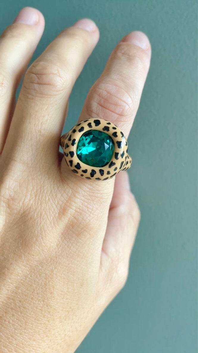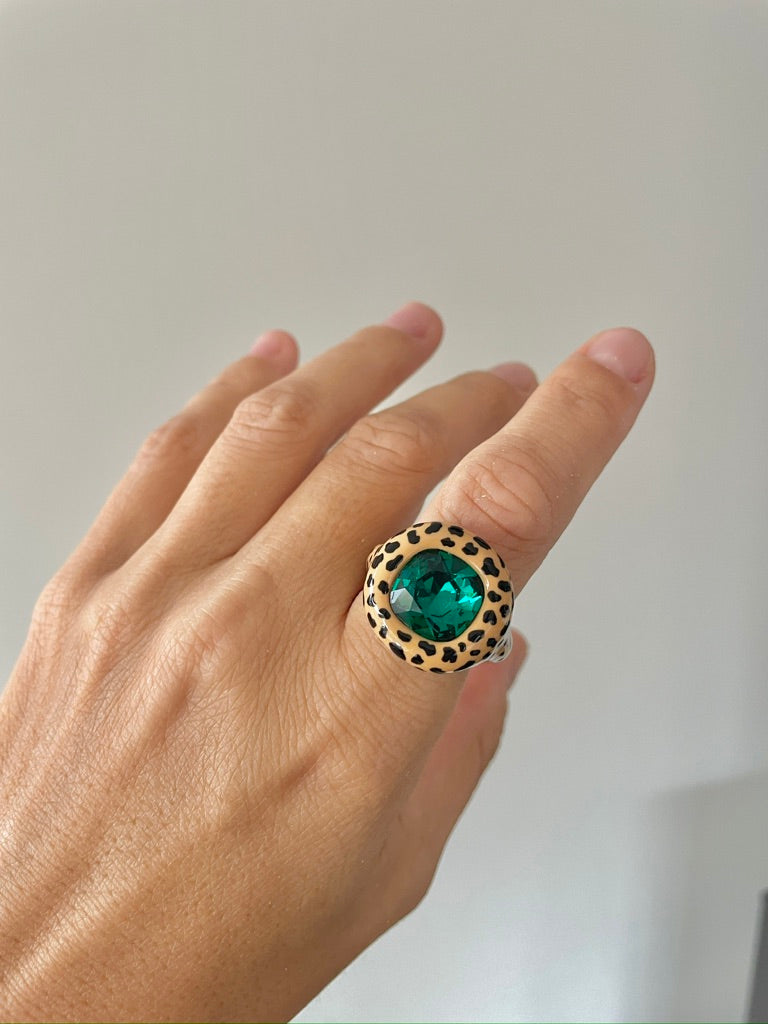 Beige Leopard Print Cushion Green Emerald Crystal Polymer Ring