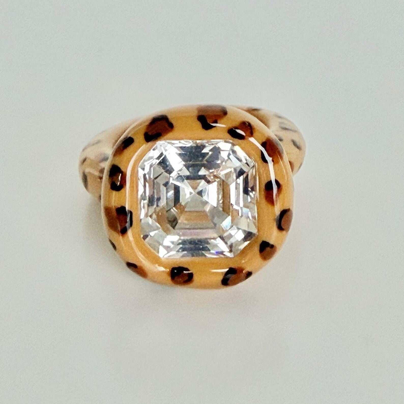 Beige Leopard Big Square Octagon Polymer Ring Clear Crystal